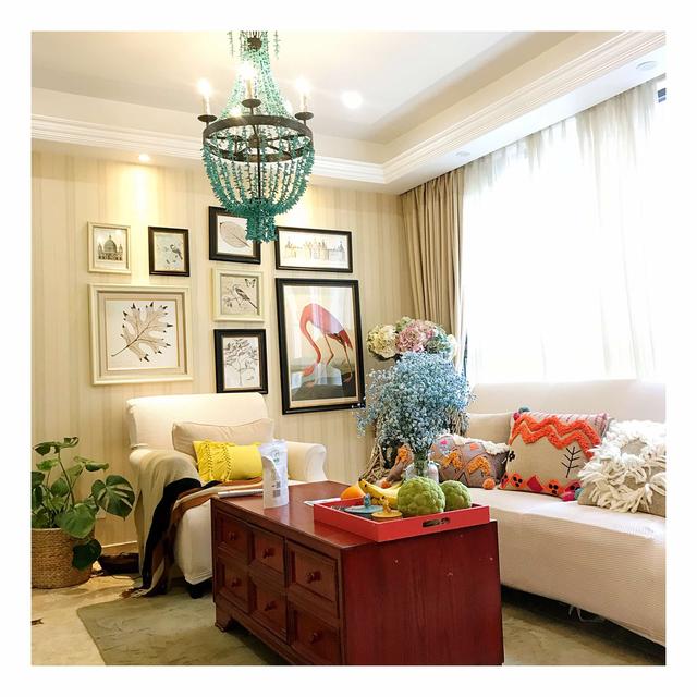 走过玄关餐厅,就是非常明亮温暖的客厅,非常有个性的吊灯,复古风格的红色实木柜子,米白色的沙发点缀着红色的抱枕,还有那显眼的装饰画,虽然颜色缤纷却不显得杂乱,主次分明。给人的感觉更是热情洋溢。