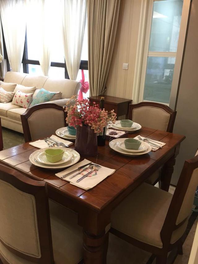 深色实木餐桌看起来就沉稳大气,软靠垫的餐椅线条优美,彰显美式乡村风情。现在这种科技皮仿布,其实很好打理呢,有脏的用湿布一擦就干净了。