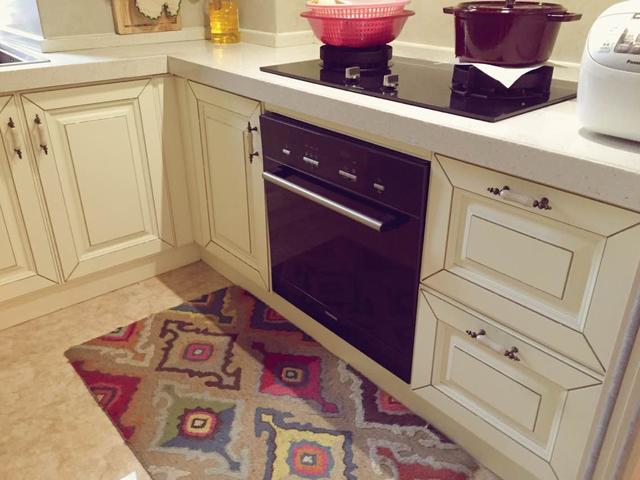 很喜欢厨房的整体橱柜面板设计,线条简洁大气,色调充满乡村气息,温暖整洁。给人大气、质朴、随意、自然而又不失生活气息的印象。厨房的设计重在实用性,地垫搭配的也很不错。