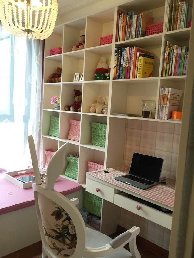 榻榻米书房其实也就是儿童房,选择做的格子书柜,收纳一目了然又整整齐齐。粉红色的点缀显得非常娇嫩,可家的兔子耳朵造型椅子,充满了童趣的味道。