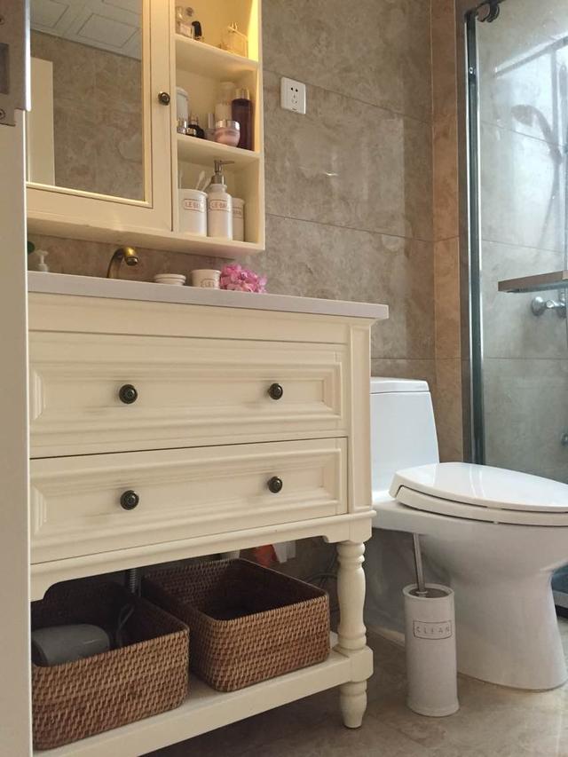 卫生间的浴室柜,浴室柜的收纳功能很强大,虽然没有干湿分区,淋浴区用玻璃隔断后的效果一样很发。